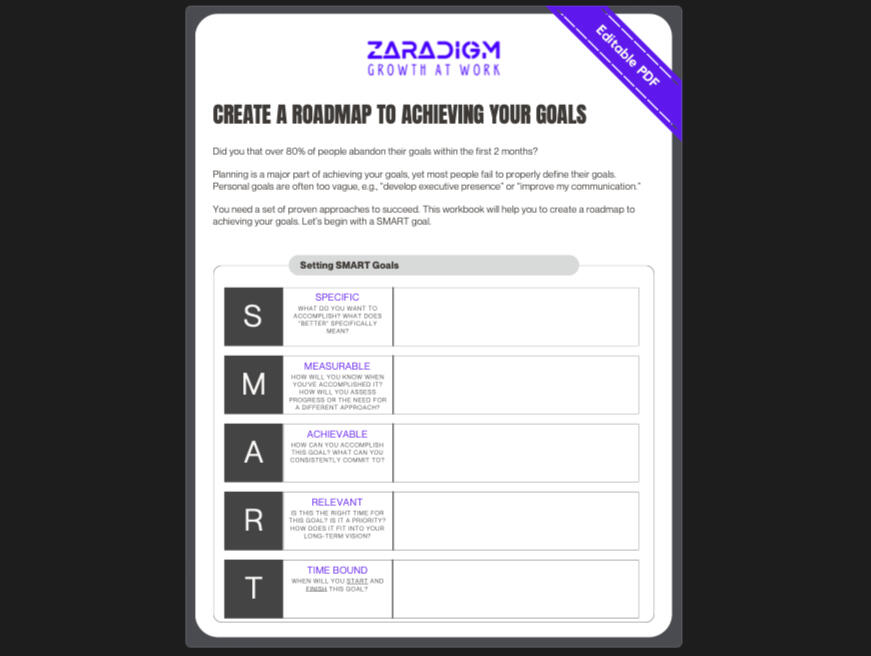 2 - A Progress MeasureThe first defines how we measure achievement or how we will know that we have reached your goal.The second defines how you track progress. How will we measure it?I will help you in our first session to fine-tune this.You can also use this PDF to develop realistic goals you will more likely achieve - based on science and empirical evidence from thousands of leaders like you.