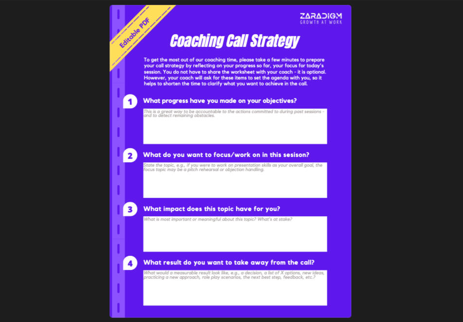 Each time we meet, we will have a specific agenda. Coming to the call by just showing up will not maximize your experience. Instead, set your intention and come prepared to engage, discover, learn, practice, and be challenged.To wrap your mind around the session, please complete the call strategy form you will be sent by your coaching account.If you're curious, below is a preview of what this looks like.